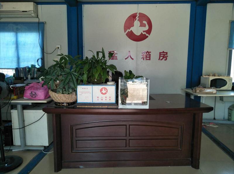 一楼办公室第三个箱子开着一个玻璃门,可以看到外面的景色,进门正中间放着一个办公桌,桌子有台电脑、盆栽、集装箱模具,还有一个小鱼缸,养着3条可爱的金鱼,鱼缸里还放着一个盆栽,这是我公司司机的杰作了。墙面正中间还有我公司的招牌猛人箱房,右边放着一套沙发、茶水桌、电视机、饮水机和冰箱,是招待客户备用的。左边的是财务办工的地方,有电脑、打印机、保险柜、验钞机和文件柜,财务怕冷,公司还有特意备了一台风扇呢。财务办公旁还有一个房间,那是老板的办公室了,整个办公室我们配置了3台空调,老板1台,外面2台,一般外面只开1台空调,财务怕冷开个风扇就可以了。一楼还有一个集装箱是用来做厨房的,里面配置了煤气炉、油烟机和桌子,平时我们就是在那用餐的。二楼是宿舍,楼梯在右边,楼梯旁还有一个2人卫生间,有热水器和洗衣机。宿舍都配置了床位和冷暖空调,这样不管是炎热夏天还是寒冷的冬天,我们都很愉快的度过了。